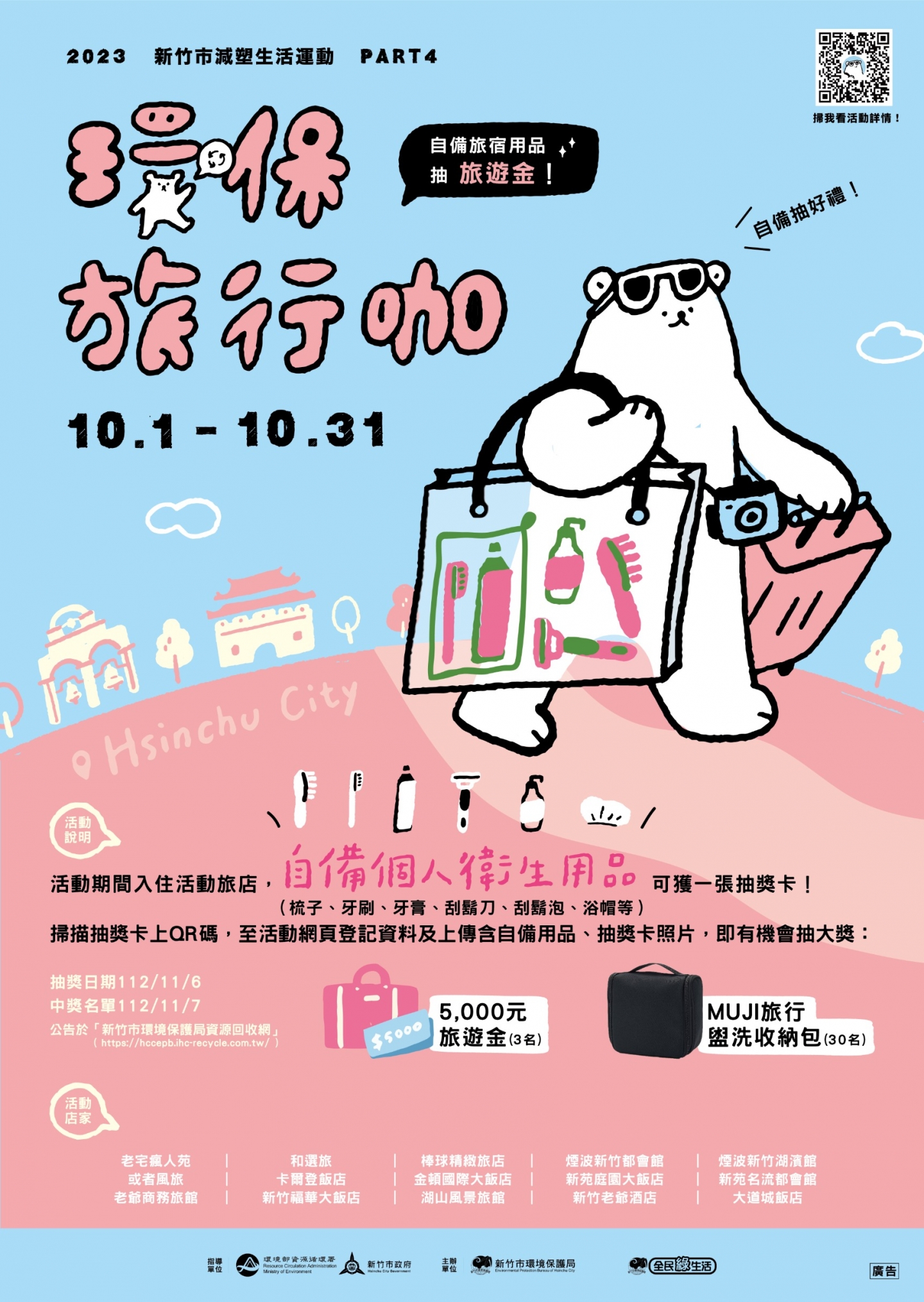 新竹市政府為打造「宜居永續」城市,市府環保局今天指出,今年市府與轄內15家旅宿業者合作推出「環保旅行咖.自備抽好禮」活動,自10月1日至10月31日,旅客入住響應環保且自備個人衛生用品(梳子、牙刷、牙膏、刮鬍刀、刮鬍膏、浴帽),即可向業者索取活動抽獎卡參加抽獎,有機會抽中5000元旅遊金。