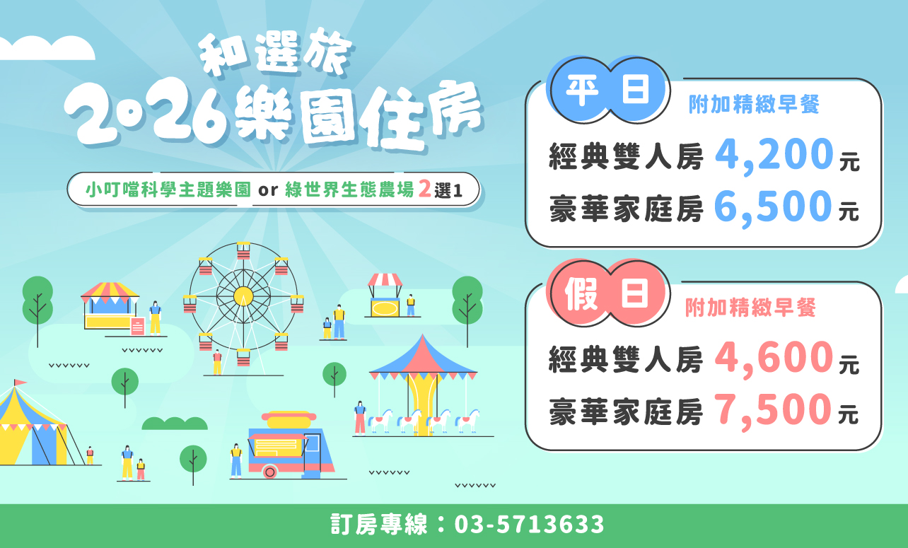 01 以上價格依房型含早餐及門票(小叮噹科學主題樂園或綠世界生態農場二擇一)