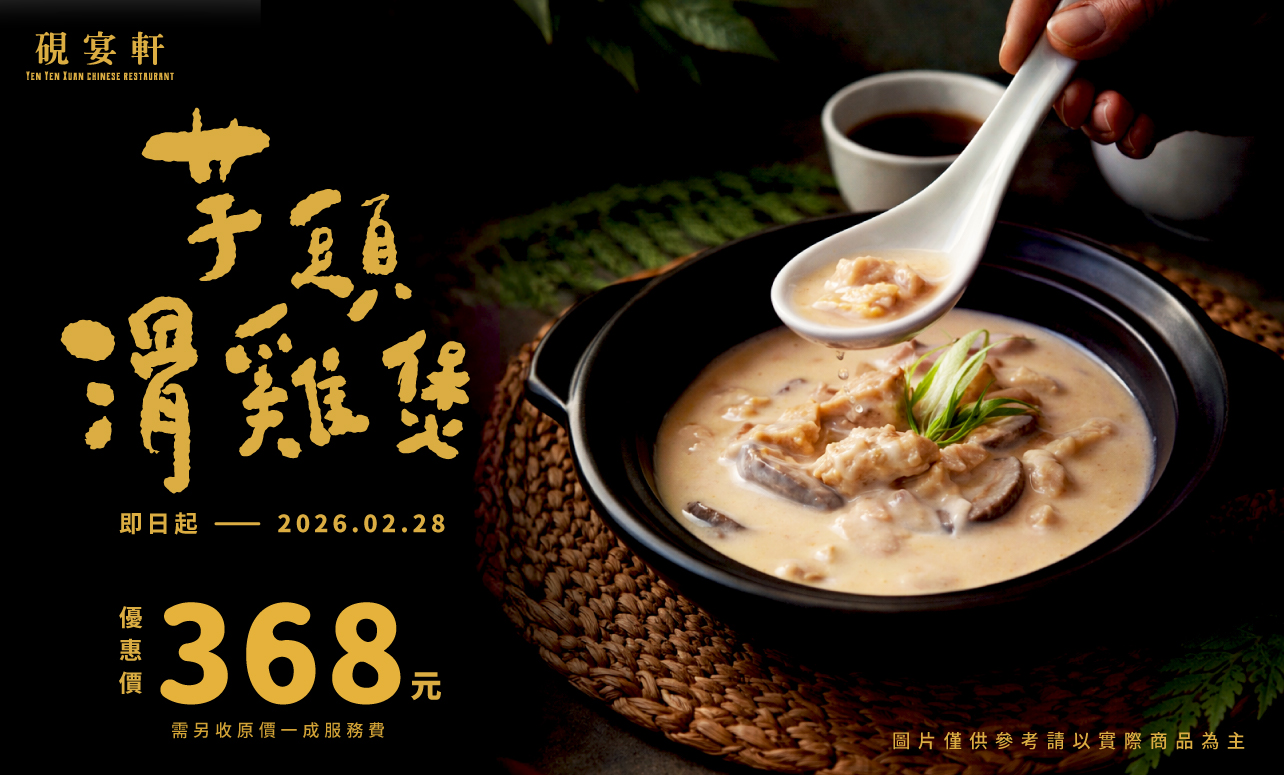本期主打星-芋頭滑雞煲,美味上市! 【活動日期】即日起-2026/02/28 【餐點內容】 品項 原價 優惠價 1 芋頭滑雞煲 $420 $368 *以上價格需加10%服務費 訂位專線📞03-5715888#2201 【注意事項】 1. 桌菜菜單、宴席恕不適用 2. 適用暐順之友會員累點 3. 恕不與其他優惠合併使用 4. 硯宴軒保有修改權利,未盡事宜依現場為主